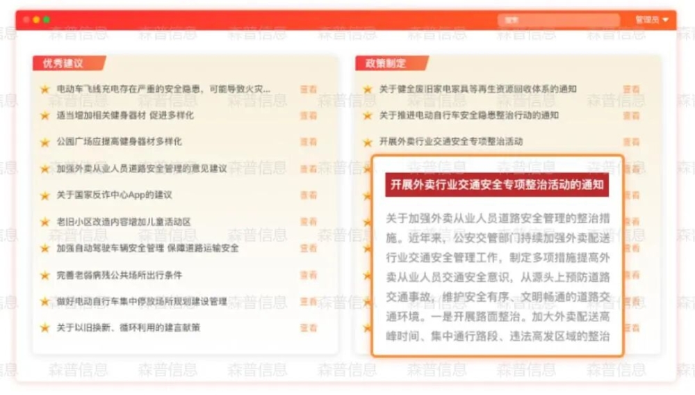为了沉淀民意和有效转化为政策实践,平台构建了包括金牌建议人库、专家库、政策法规库和经典建议库在内的案例智库体系。这些宝贵的知识资产不仅为公众提供了学习范本,也为政府工作人员提供了培训素材和决策参考,实现了人民智慧的可持续利用和价值增值。