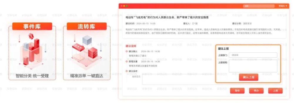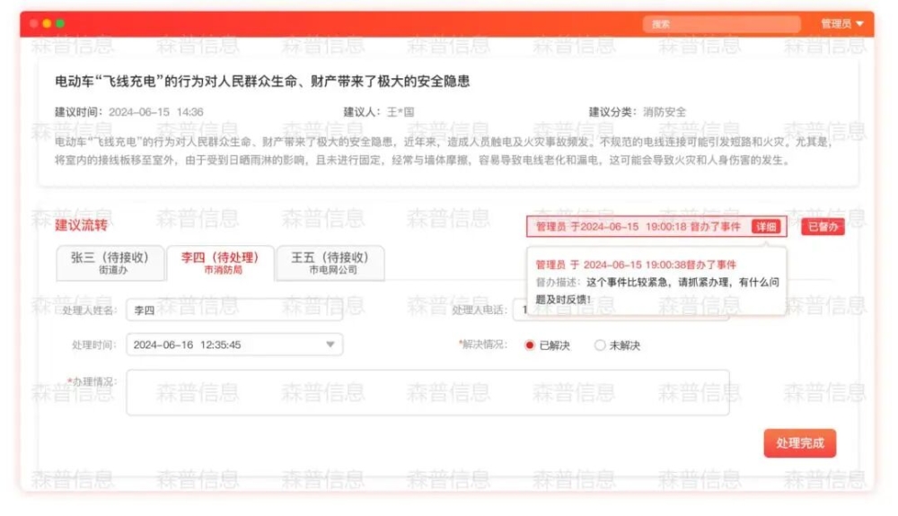 对于收集的人民建议,平台设置统一的指挥中心,根据建议的类型、区域、紧急程度进行转派办理,实现建议办理全过程闭环管理。根据建议的性质和紧急程度,通过智能分类系统,将其分类并分配到相应的处置流转流程,同时分配至相应的工作人员;建立跨部门协作机制,平台支持多部门联办,打破部门业务壁垒,确保不同部门能够共享信息并协同工作。