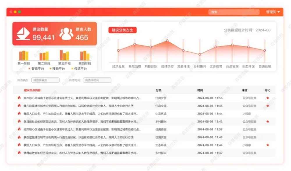 从海量建议中精准捕捉“金点子”。第一步“广听民意”打造N个渠道广泛征集人民群众的意见建议,系统全程记录建议来源信息,收集汇总至数据中心,确保每一份智慧都不被浪费。面对海量信息,第二步是“智能研判”:利用自然语言处理和数据挖掘技术,自动识别建议的主题、紧急程度和价值潜力,初步筛选出高价值、高可行性的建议。第三步是“调研论证”:系统将筛选后的建议分拨至相关领域(如经济发展、城市建设、民生保障等),由专业团队进行初步调研和可行性分析,确保建议符合实际需求和政策方向。这一阶段的核心是“聪明地听”,避免盲目收集,提升决策质量。